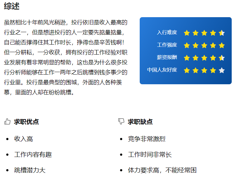 说了这么多,同学们对投资银行是否有了一定的了解呢?虽然相比十年前风光稍逊,但投行依旧是收入最高的行业之一!拥有投行的工作经验对个人的职业发展有非常明显的帮助,想入职投行的同学们简历准备起来,专业知识和面试技巧赶快学起来!